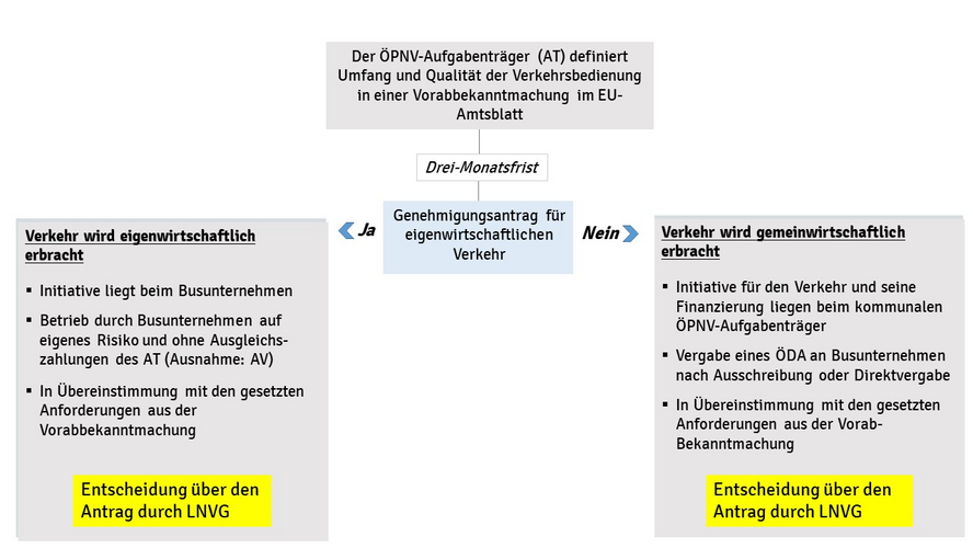 Mit der Vorabbekanntmachung nach § 8a Abs. 2 S. 2 PBefG i.V.m. Art. 7 Abs. 2 VO 1370/2007 beginnt eine dreimonatige Antragsfrist für eigenwirtschaftliche Verkehre. Etwaige eigenwirtschaftliche Genehmigungsanträge haben sich ausschließlich an dem in der Vorabbekanntmachung gesetzten Anforderungsniveau zu messen, wenn sie genehmigt werden und die Vergabeinitiative des Aufgabenträgers hindern sollen. Liegen nach dieser Frist keine oder keine genehmigungsfähigen Anträge für eigenwirtschaftliche Verkehre vor, ist der Weg für die Vergabe eines Verkehrsvertrags, eines sog. öffentlichen Dienstleistungsauftrags (ÖDA), frei.